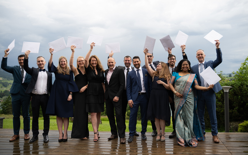 La cérémonie de remise des diplômes de la classe du EMBA in Integrated Management 2023-2024 s'est déroulée le mardi 25 juin au Golf de la Gruyère (Pont-la-Ville) entre deux averses.