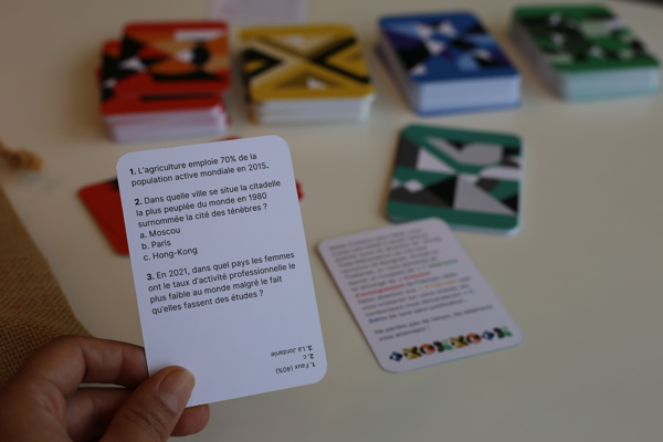 Nach dieser langen Arbeit schlägt das Team von MMXXXX ein Spiel mit 210 Karten und 600 Fragen in farbenfrohem Design vor, das von F+F studio, einem lokalen Freiburger Unternehmen, entworfen und realisiert und in der Fondation Alfaset in La Chaux-de-Fonds gedruckt wurde, einer geschützten Werkstatt, die Menschen in der beruflichen Wiedereingliederung oder mit einer Beeinträchtigung beschäftigt. Sie hoffen, die 300 Exemplare aus ihrer ersten Produktion absetzen zu können und so die Summe, die ihnen zu Beginn zur Verfügung gestellt wurde (je 1000 CHF), zurückzahlen zu können.