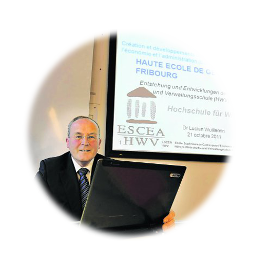 The 20th anniversary of the University of Applied Sciences in Business Administration is celebrated in the company of numerous personalities from the canton of Fribourg. It is also on this date that Lucien Willemin, director of the school since 1994, retires and hands over his position to Olaf Meyer, formerly deputy director for the HEG-FR. ©La Liberté